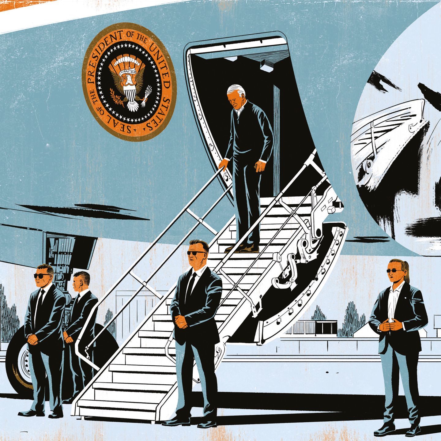 Sauf que, lorsque j’ai commencé à le suivre, il grimpait dans Air Force One par un grand escalier, menant à l’étage principal de l’appareil. Avant d’embarquer, il se retournait et saluait. Cette silhouette en surplomb, découpée sur le bleu du ciel et du fuselage, était l’un des grands clichés de la mise en scène présidentielle – d’ailleurs j’en ai plein mon téléphone et j’ai bien souvent partagé l’image sur les réseaux sociaux. À partir de l’été 2023, après qu’il a chuté lourdement sur scène lors d’une cérémonie militaire, le président emprunte la petite passerelle, plus courte et plus robuste, normalement réservée aux jours de grand vent. Finie, la pose avantageuse.