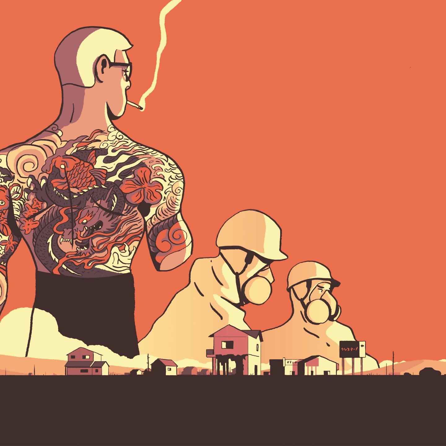 La bourgade a connu ses années fastes. Dans les années 1970, le nucléaire promettait emplois, prouesses technologiques et avenir meilleur. Des manifestations avaient eu lieu, mais elles avaient vite été étouffées par les médias de masse, financés par les fabricants des réacteurs. Le soutien public a ensuite été acheté avec une mairie flambant neuve, un complexe sportif, et un luxueux hôtel spa que me fait visiter Yanai. Surplombant l’océan, nous marchons au milieu d’une forêt de lys radioactifs qui recouvrent des allées autrefois bien tracées. Mon compteur Geiger grésille en chœur avec les cigales de l’été. Du haut d’une terrasse panoramique donnant sur une mer de sacs noirs, le caïd me parle du printemps, des cerisiers en fleur, des vergers, des rizières, des vestiges préhistoriques et des premiers habitants qui ont peuplé ces terres. C’est plus tard, quand il évoque son passé de yakuza, que je comprends pourquoi il m’a emmenée là : ce chef de gang s’est donné comme nouvelle mission de protéger la terre de ses ancêtres.