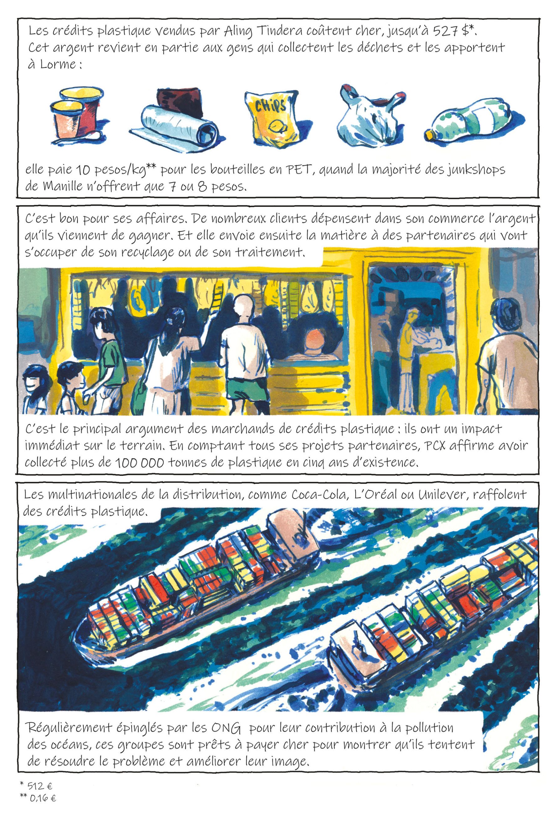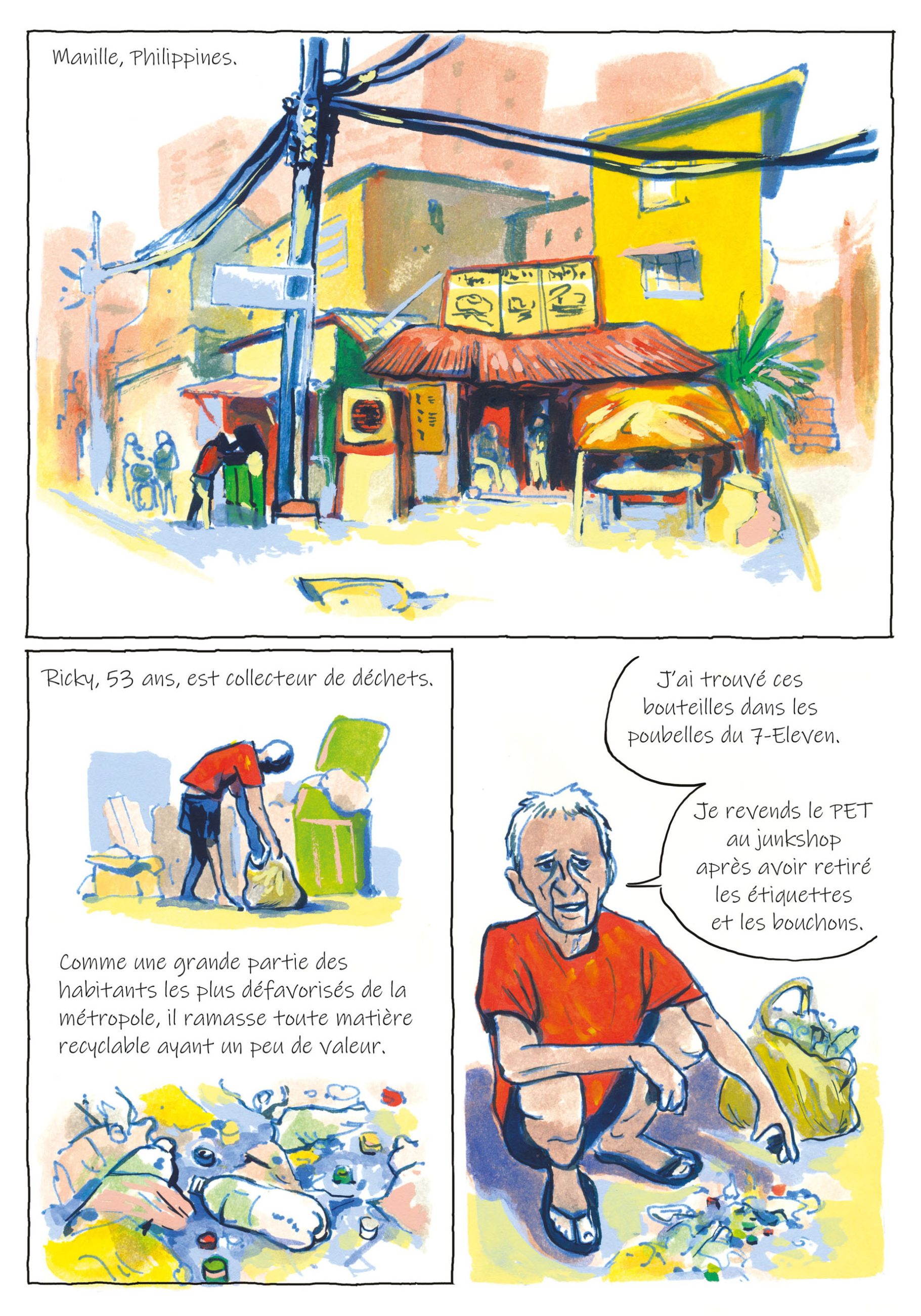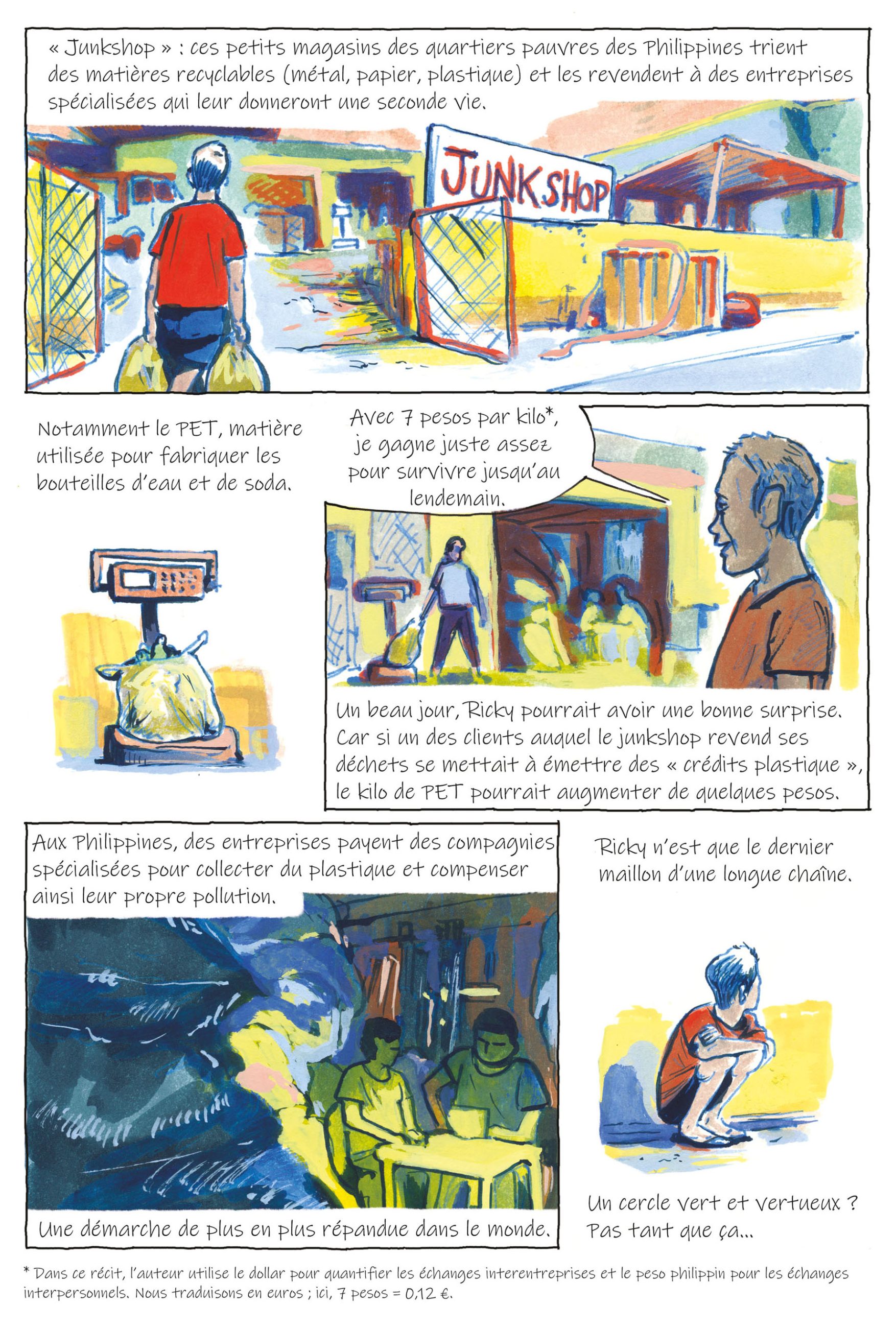 Manille, Philippines. Ricky, 53 ans, est collecteur de déchets. Comme une grande partie des habitants les plus défavorisés de la métropole, il ramasse toute matière recyclable avant un peu de valeur. « J’ai trouvé ces bouteilles dans les poubelles du 7-Eleven. Je revends le PET au junkshop après avoir retiré les étiquettes et les bouchons. » « Junkshop » : ces petits magasins des quartiers pauvres des Philippines trient des matières recyclables (métal, papier, plastique) et les revendent à des entreprises spécialisées qui leur donneront une seconde vie. Notamment le PET, matière utilisée pour fabriquer les bouteilles d’eau et de soda. « Avec 7 pesos par kilo, je gagne juste assez pour survivre jusqu’au lendemain. » Un beau jour, Ricky pourrait avoir une bonne surprise. Car si un des clients auquel le junkshop revend ses déchets se mettait à émettre des « crédits plastique », le kilo de PET pourrait augmenter de quelques pesos…