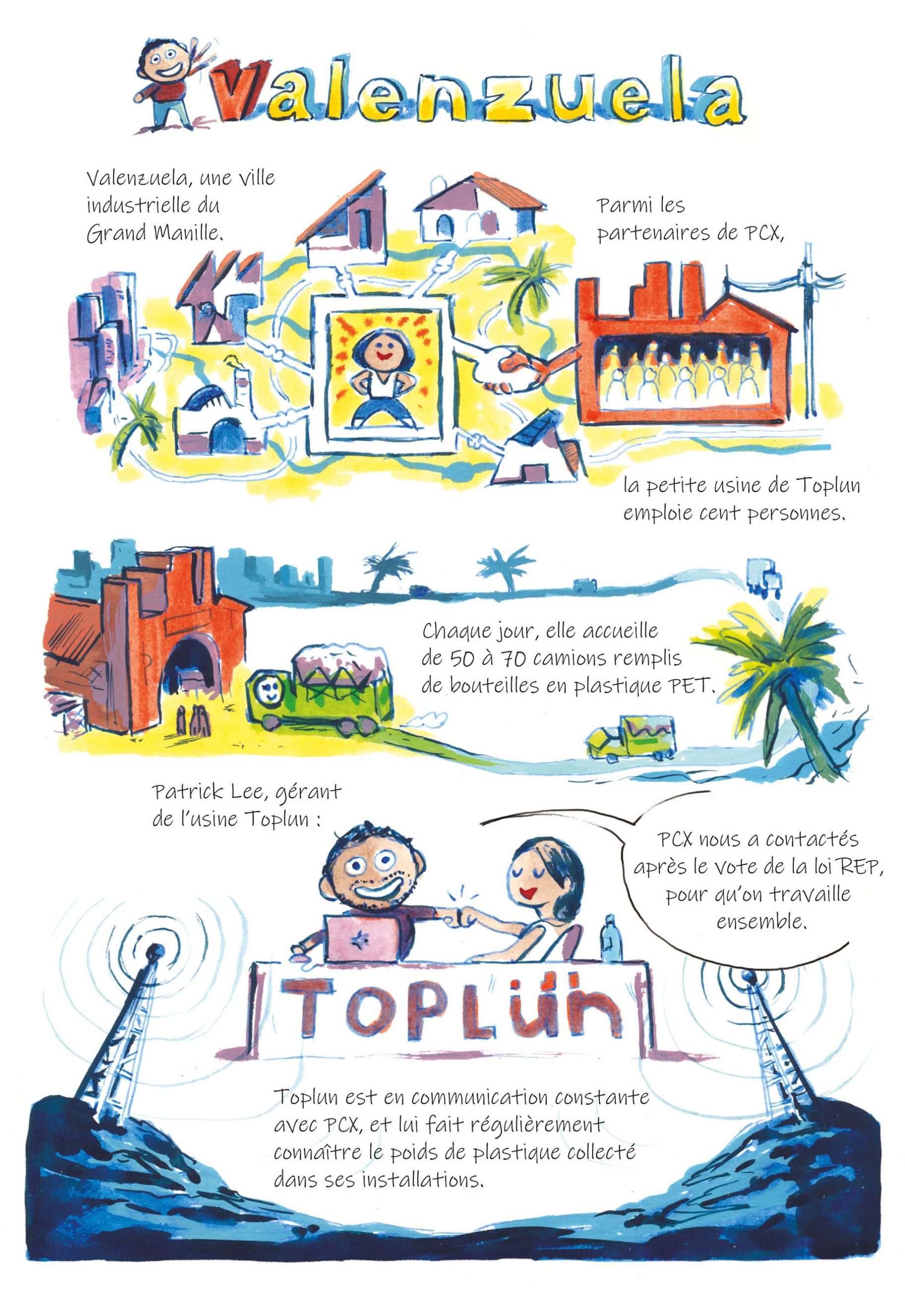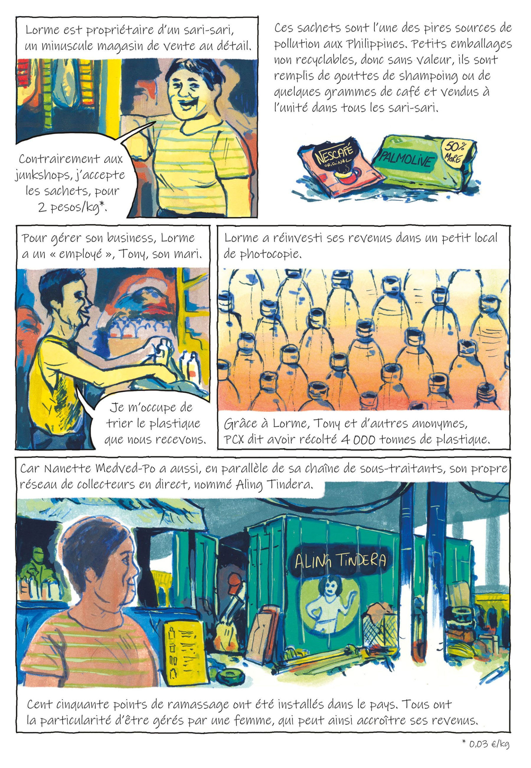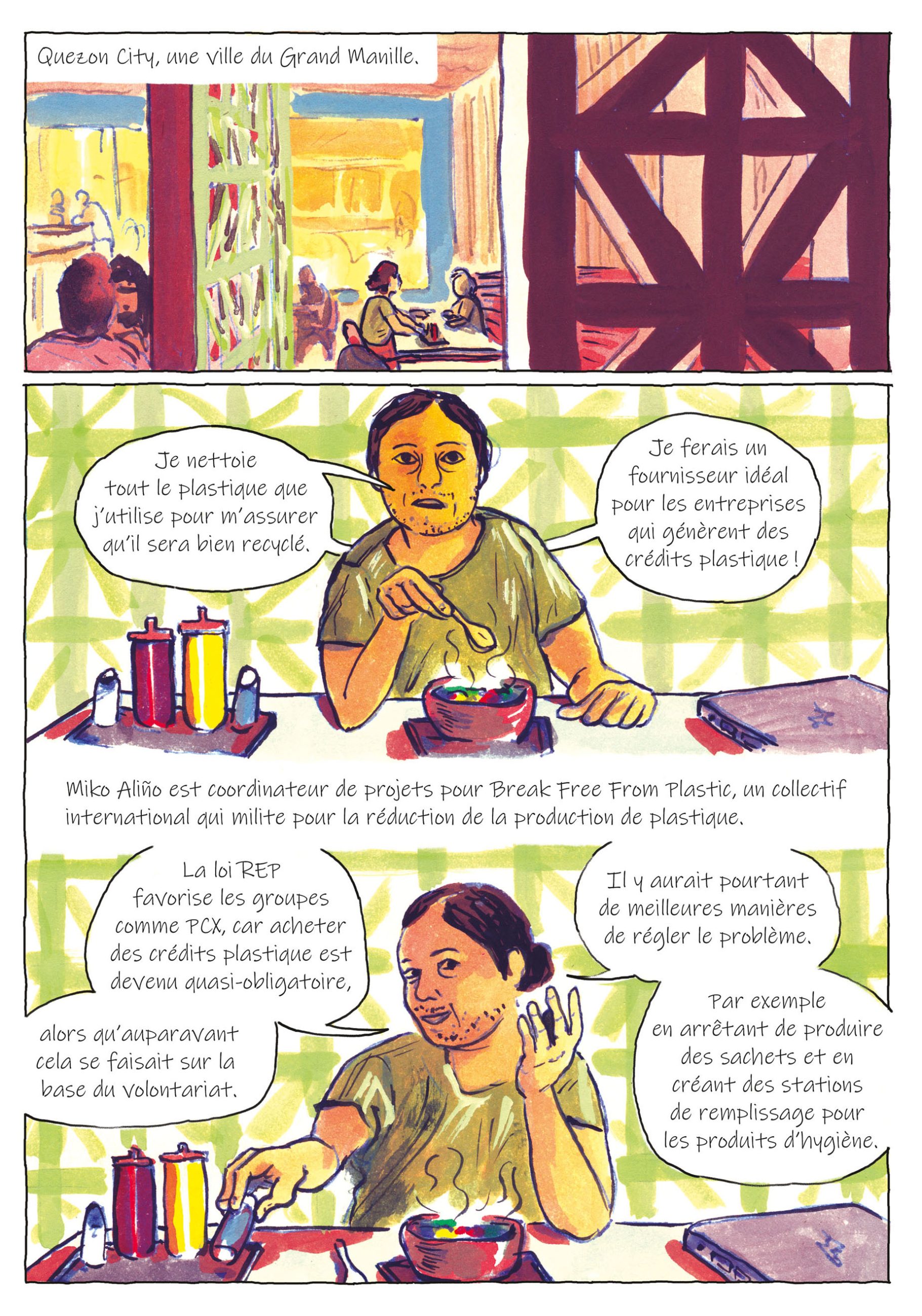 Manille, Philippines. Ricky, 53 ans, est collecteur de déchets. Comme une grande partie des habitants les plus défavorisés de la métropole, il ramasse toute matière recyclable avant un peu de valeur. « J’ai trouvé ces bouteilles dans les poubelles du 7-Eleven. Je revends le PET au junkshop après avoir retiré les étiquettes et les bouchons. » « Junkshop » : ces petits magasins des quartiers pauvres des Philippines trient des matières recyclables (métal, papier, plastique) et les revendent à des entreprises spécialisées qui leur donneront une seconde vie. Notamment le PET, matière utilisée pour fabriquer les bouteilles d’eau et de soda. « Avec 7 pesos par kilo, je gagne juste assez pour survivre jusqu’au lendemain. » Un beau jour, Ricky pourrait avoir une bonne surprise. Car si un des clients auquel le junkshop revend ses déchets se mettait à émettre des « crédits plastique », le kilo de PET pourrait augmenter de quelques pesos…