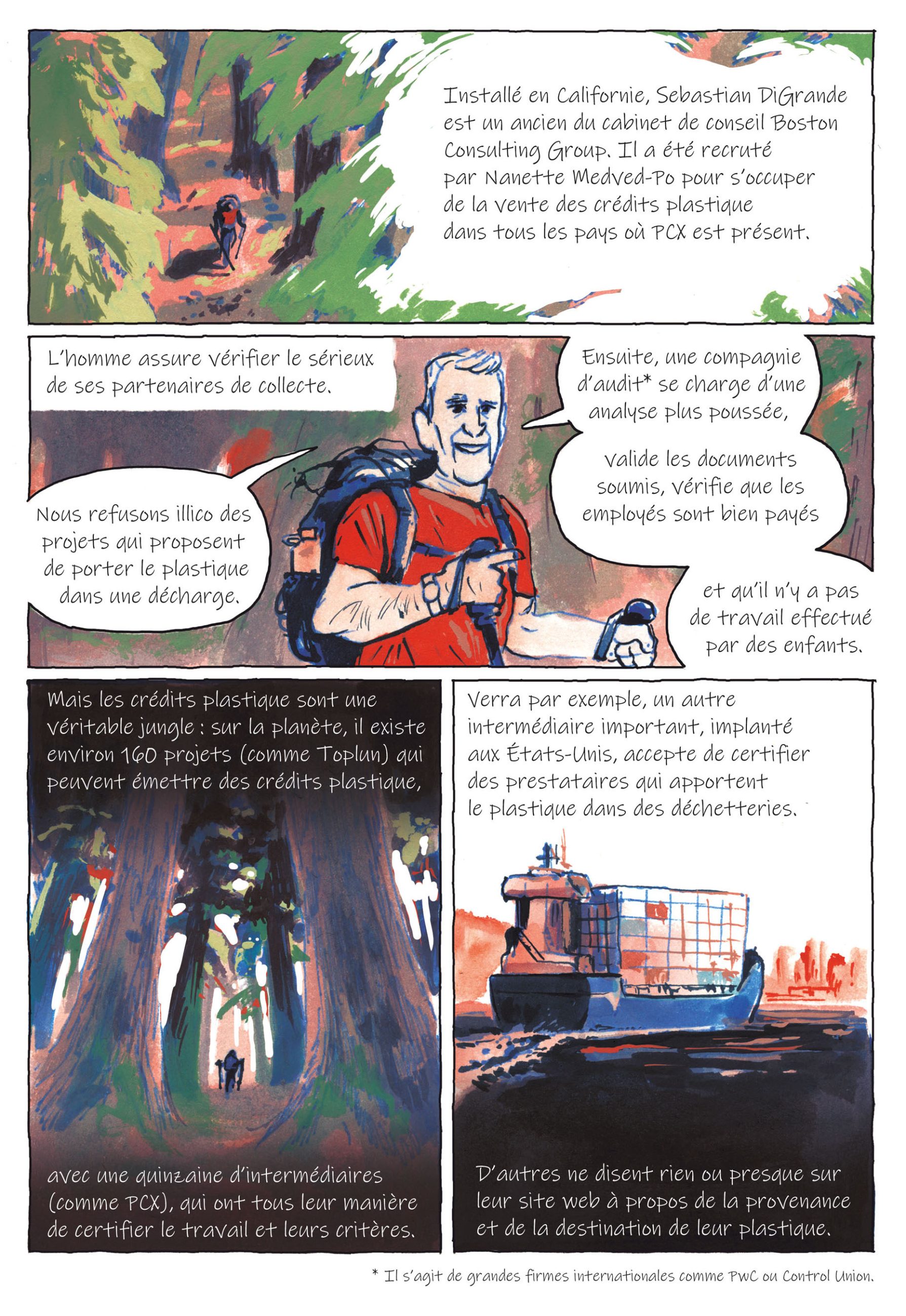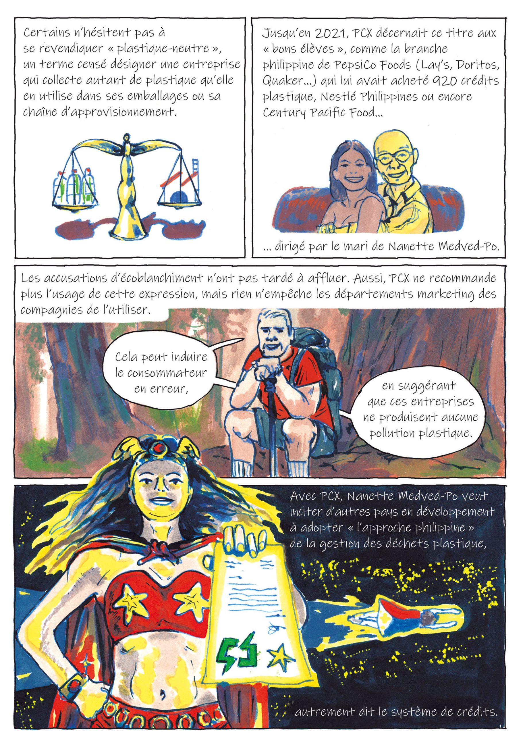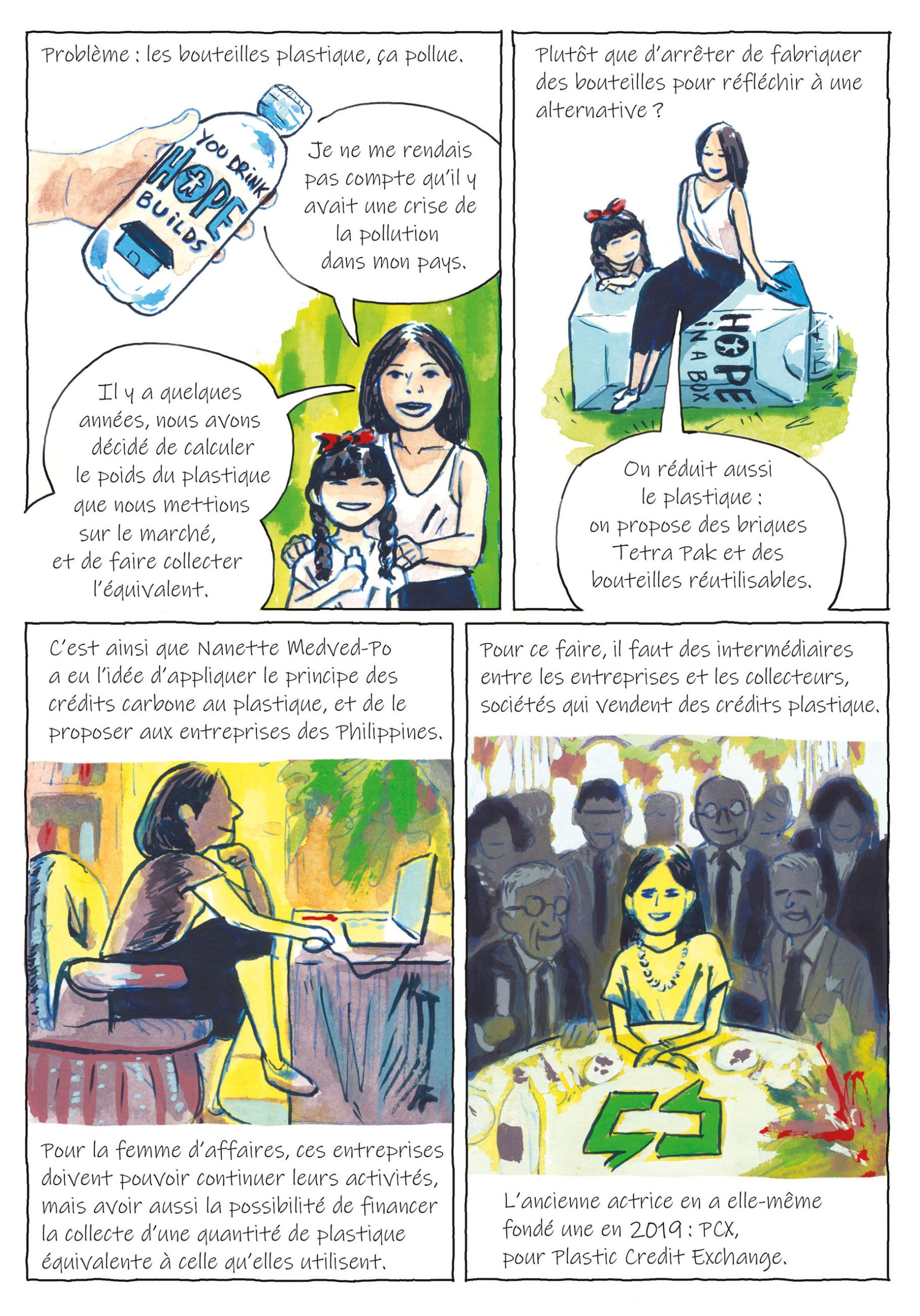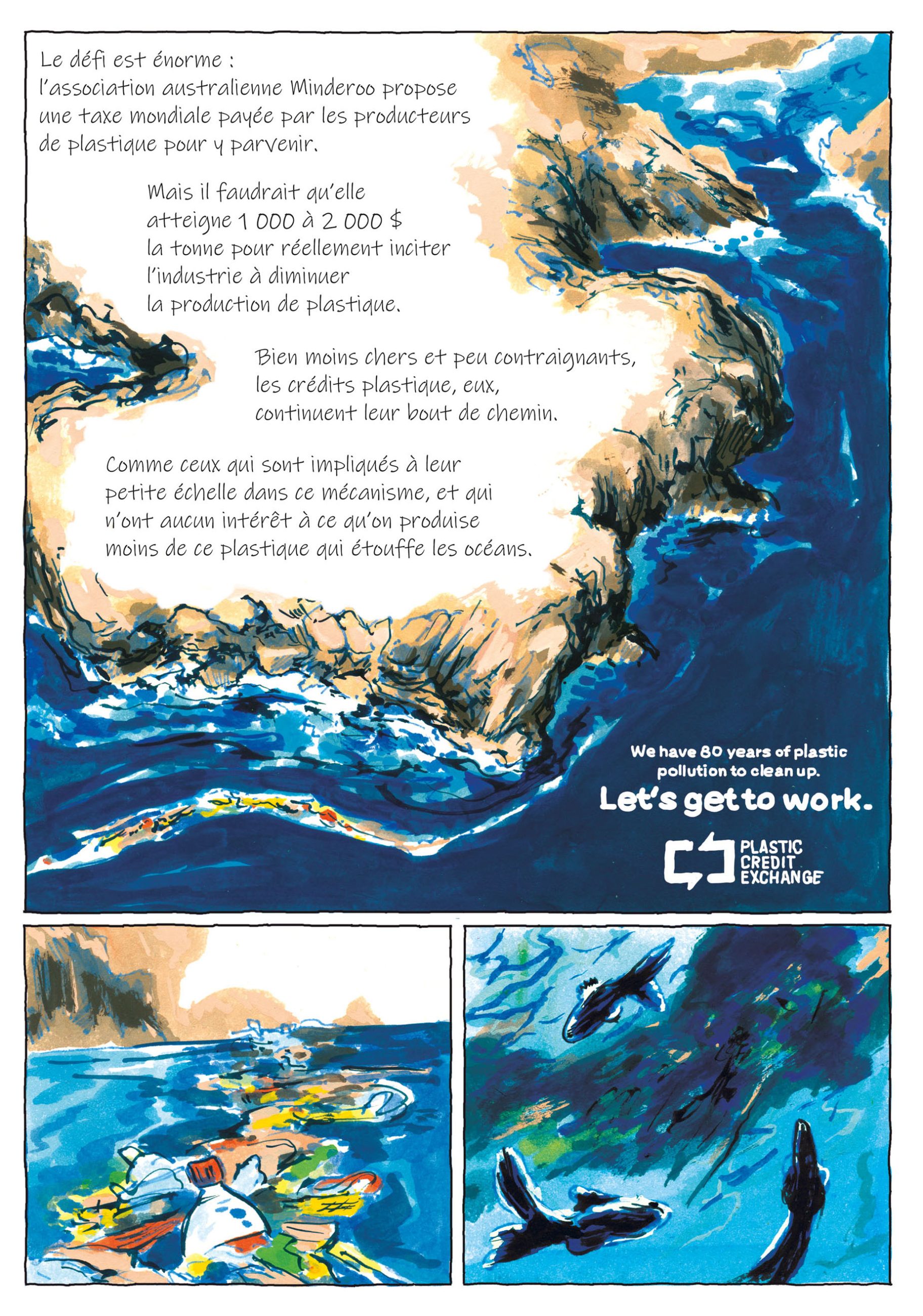 Une ancienne star du showbiz a créé un système de crédits plastique qui, sur le modèle des crédits carbone, permet aux entreprises de compenser leur propre pollution. Problème : la production mondiale de sacs, bouteilles, emballages… ne diminue pas, et les océans s’emplissent toujours plus de déchets. Comment une fausse bonne idée est-elle promue en solution miracle ? Explications en bande dessinée.